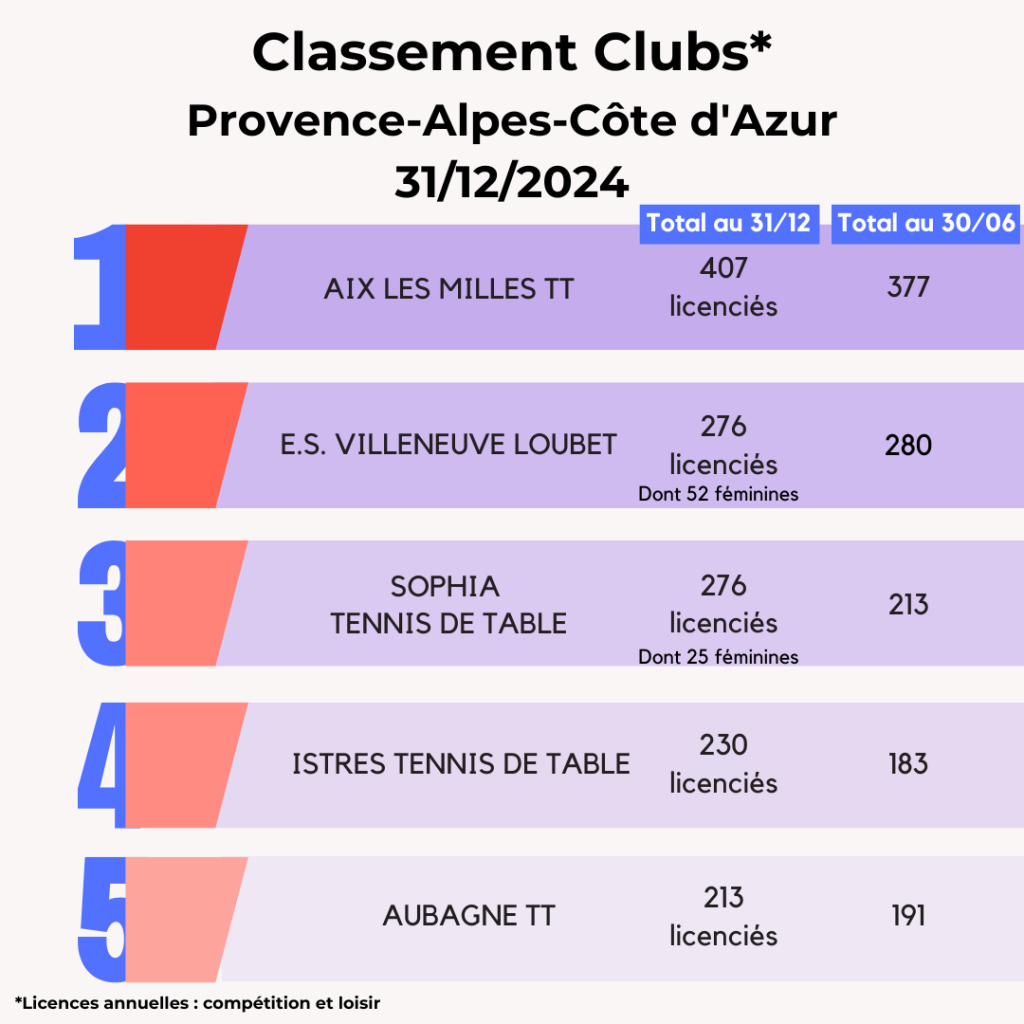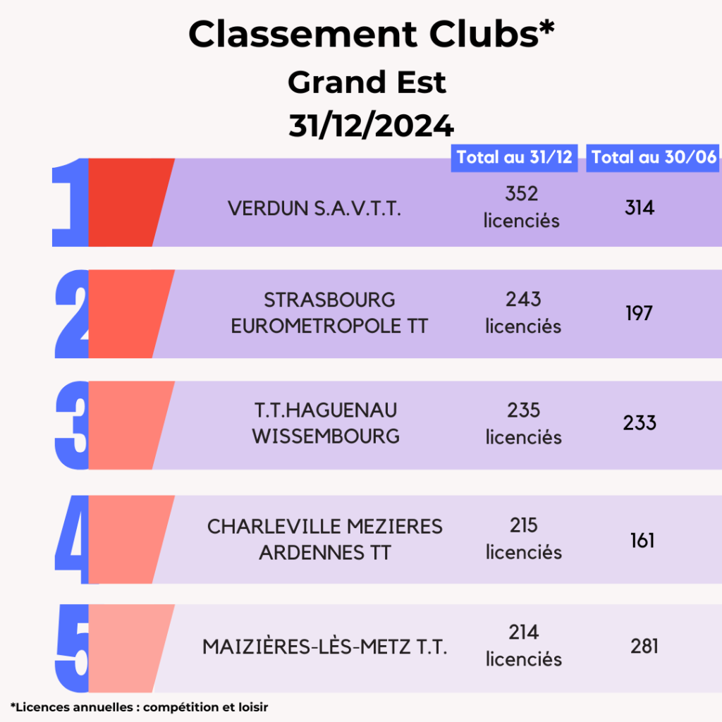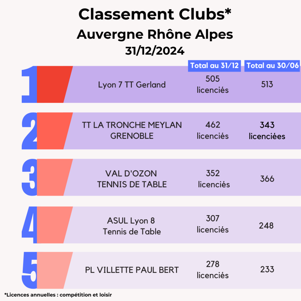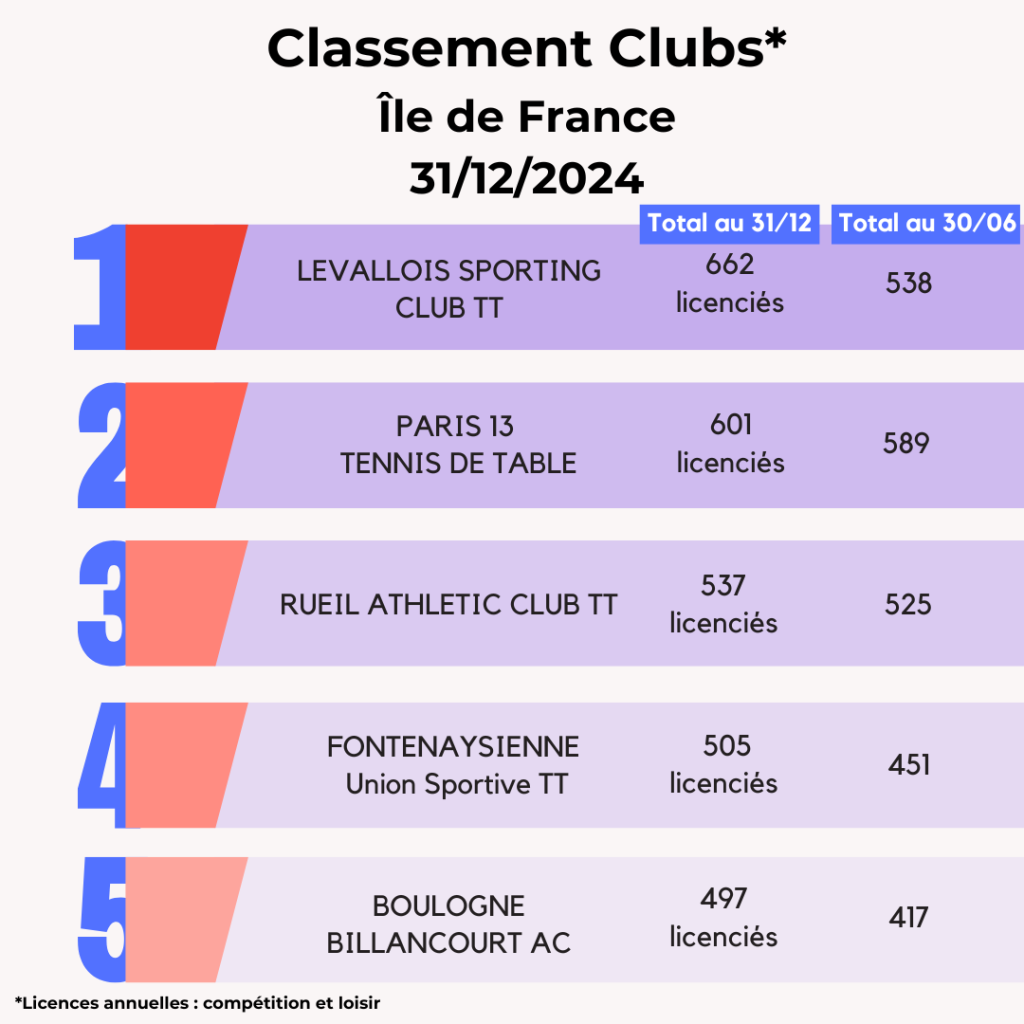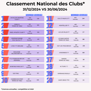 Lors de la saison 2024-2025, la FFTT peut compter sur l’engagement de ses 3 095 clubs affiliés et leurs bénévoles qui œuvrent au quotidien pour faire vivre le ping partout en France et poursuivre son développement. La FFTT souligne aujourd’hui leur dynamique et les félicite par ce Top 20 des clubs par licenciés au 31 décembre avec leur progression par rapport à juin 2024. Découvrez également ci-dessous les tops 5 des clubs par région.