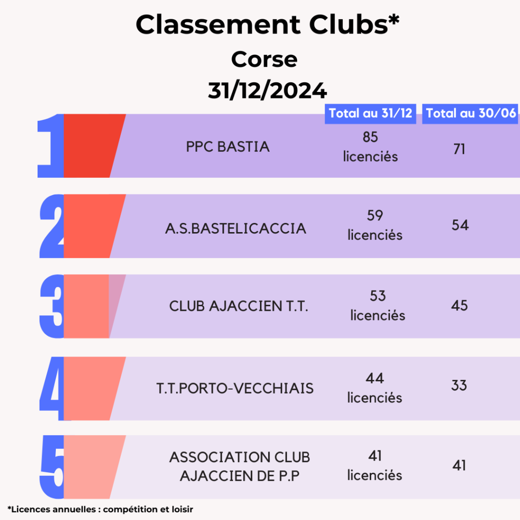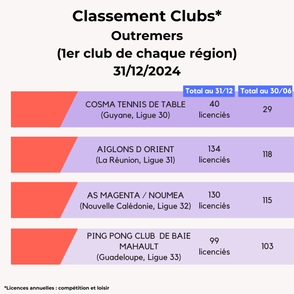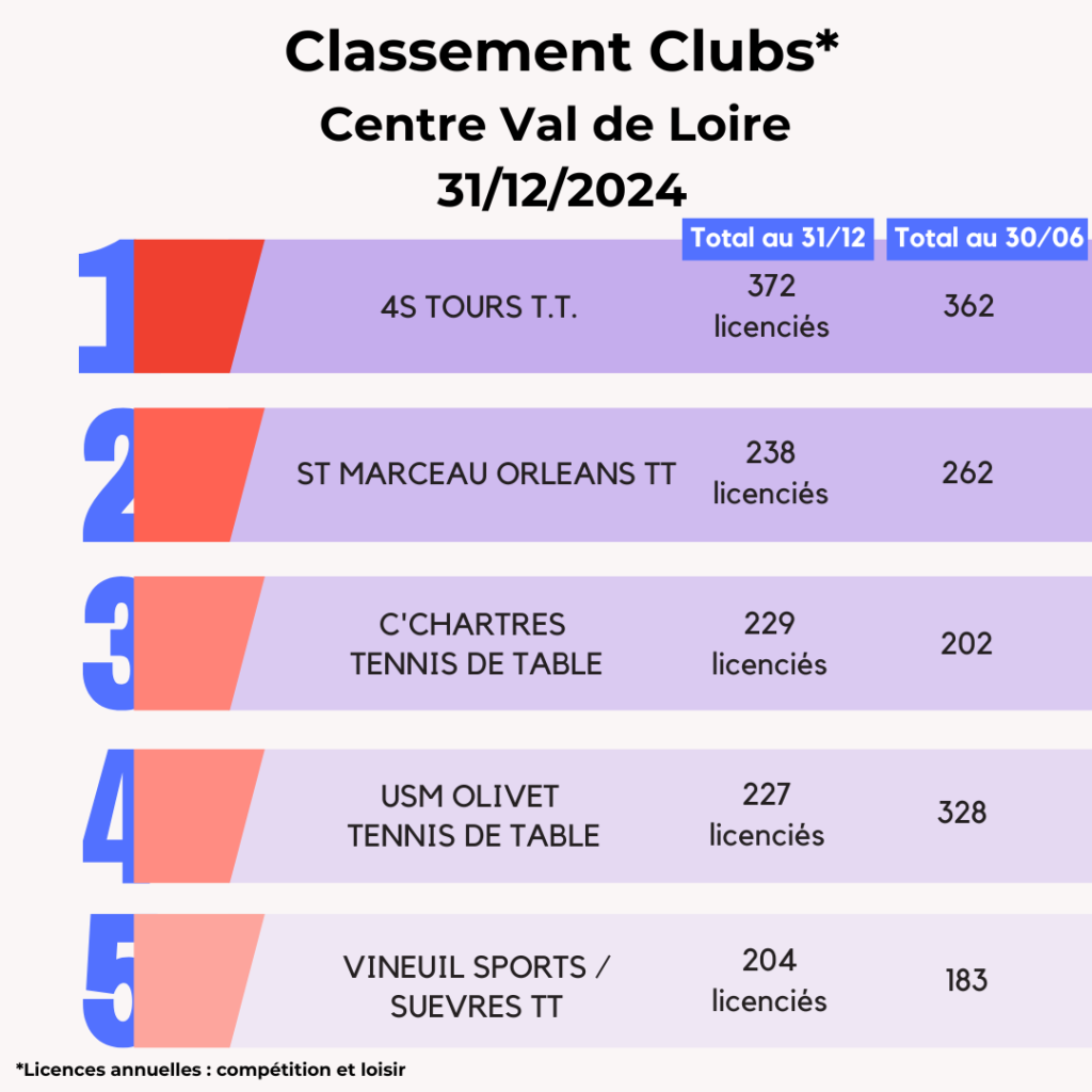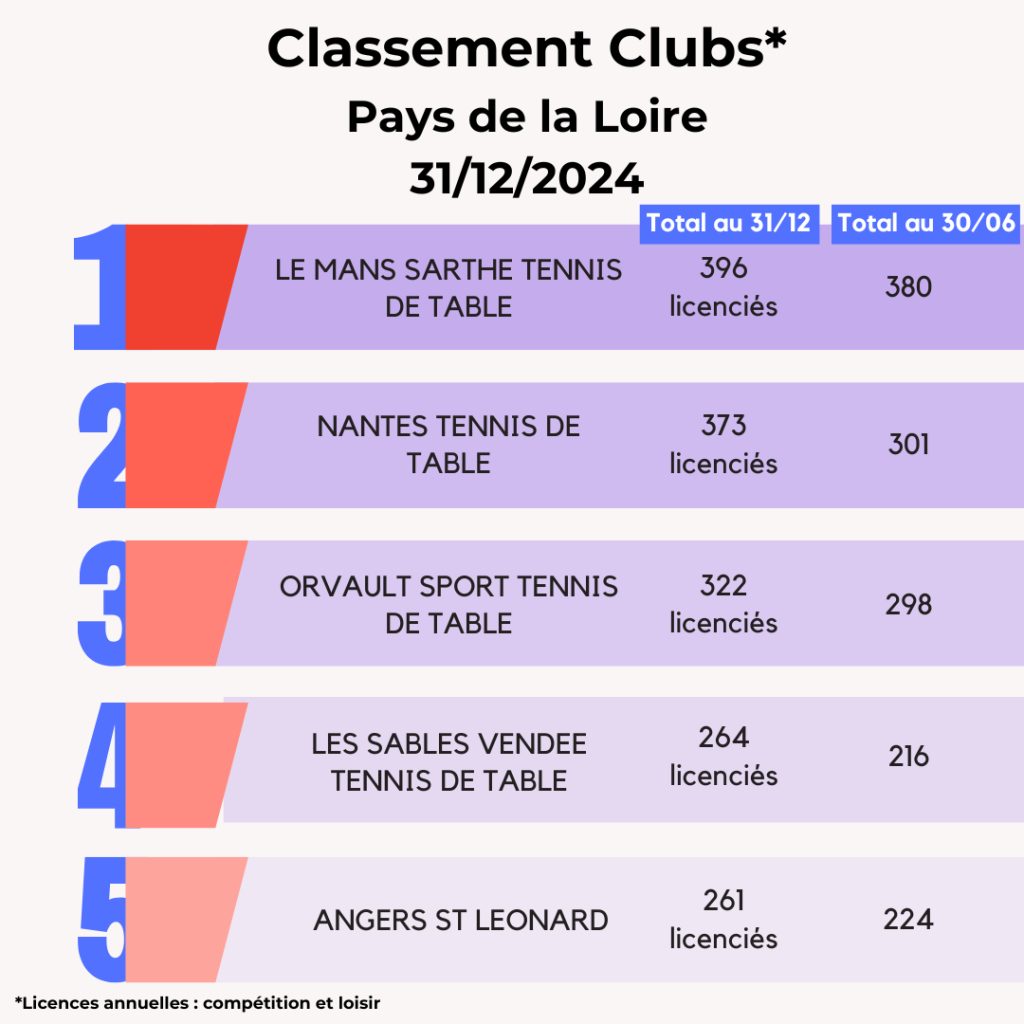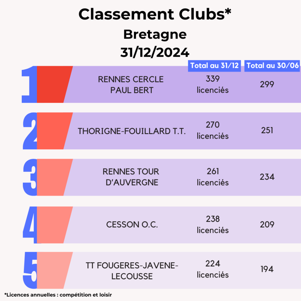 Lors de la saison 2024-2025, la FFTT peut compter sur l’engagement de ses 3 095 clubs affiliés et leurs bénévoles qui œuvrent au quotidien pour faire vivre le ping partout en France et poursuivre son développement. La FFTT souligne aujourd’hui leur dynamique et les félicite par ce Top 20 des clubs par licenciés au 31 décembre avec leur progression par rapport à juin 2024. Découvrez également ci-dessous les tops 5 des clubs par région.