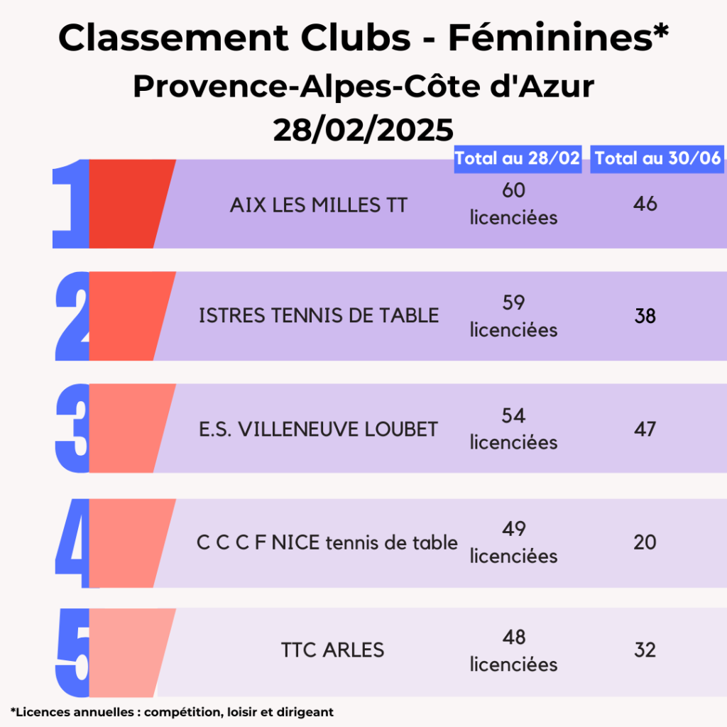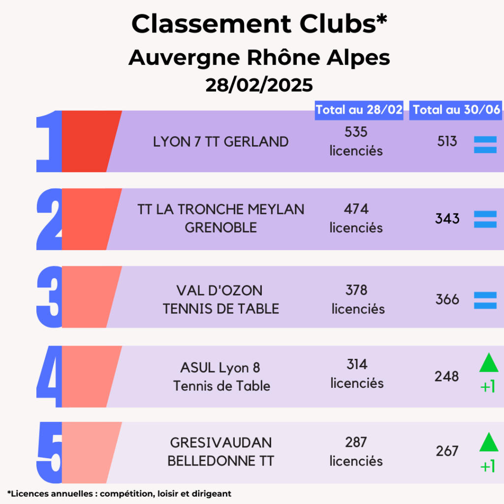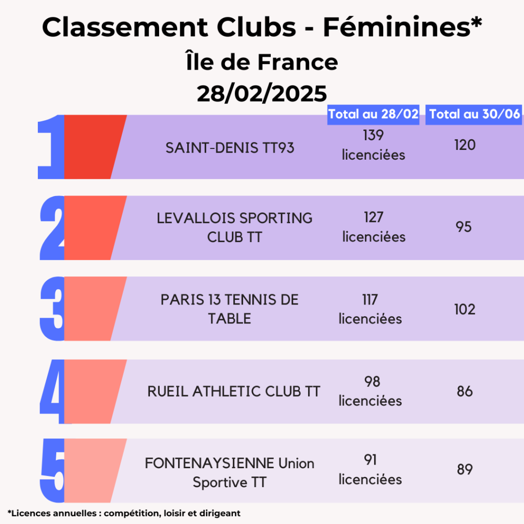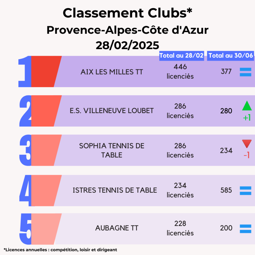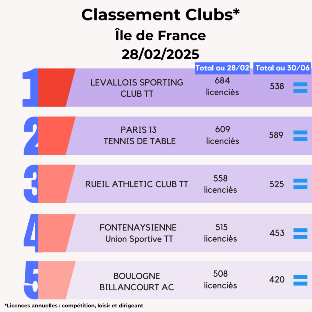 Lors de la saison 2024-2025, la FFTT peut compter sur l’engagement de ses 3 095 clubs affiliés et leurs bénévoles qui œuvrent au quotidien pour faire vivre le ping partout en France et poursuivre son développement. La FFTT souligne aujourd’hui leur dynamique et les félicite par ce Top 20 des clubs par licenciés au 28 février avec leur progression par rapport à juin 2024. Découvrez également ci-dessous les tops 5 globaux des clubs par région mais aussi, en cette année du ping féminin, les tops 5 des associations avec le plus de pratiquantes féminines !