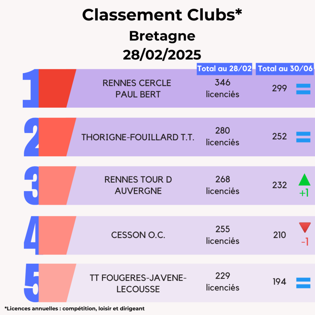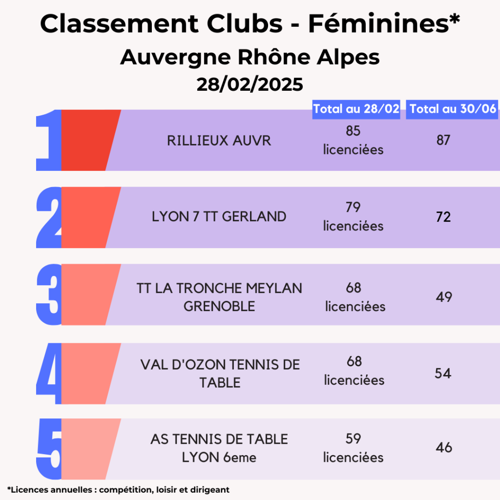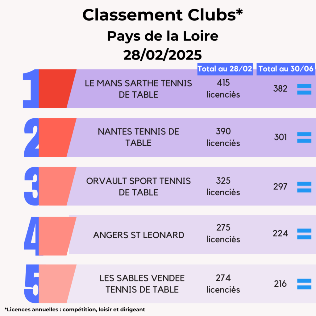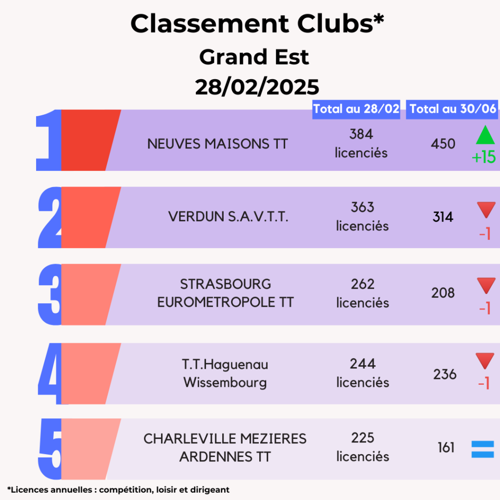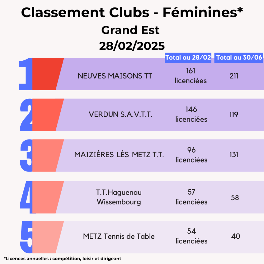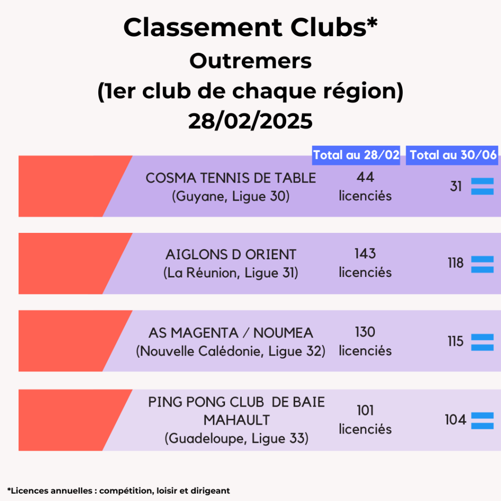 Lors de la saison 2024-2025, la FFTT peut compter sur l’engagement de ses 3 095 clubs affiliés et leurs bénévoles qui œuvrent au quotidien pour faire vivre le ping partout en France et poursuivre son développement. La FFTT souligne aujourd’hui leur dynamique et les félicite par ce Top 20 des clubs par licenciés au 28 février avec leur progression par rapport à juin 2024. Découvrez également ci-dessous les tops 5 globaux des clubs par région mais aussi, en cette année du ping féminin, les tops 5 des associations avec le plus de pratiquantes féminines !
