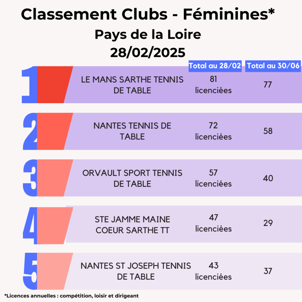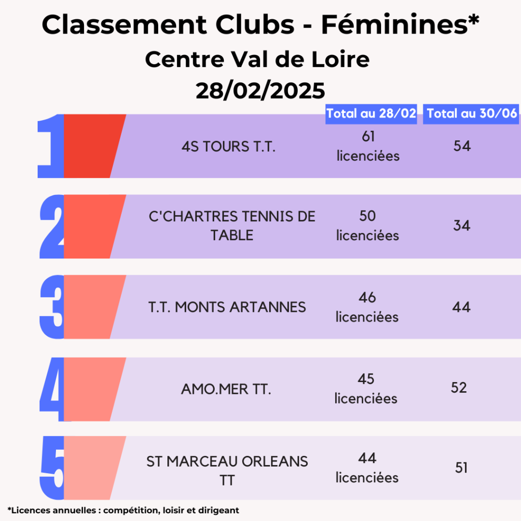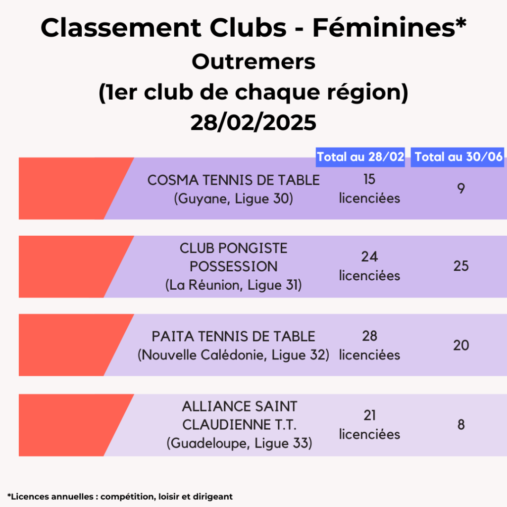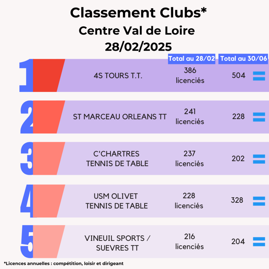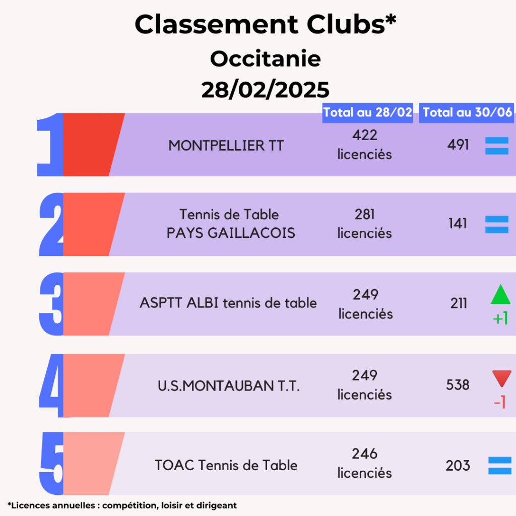 Lors de la saison 2024-2025, la FFTT peut compter sur l’engagement de ses 3 095 clubs affiliés et leurs bénévoles qui œuvrent au quotidien pour faire vivre le ping partout en France et poursuivre son développement. La FFTT souligne aujourd’hui leur dynamique et les félicite par ce Top 20 des clubs par licenciés au 28 février avec leur progression par rapport à juin 2024. Découvrez également ci-dessous les tops 5 globaux des clubs par région mais aussi, en cette année du ping féminin, les tops 5 des associations avec le plus de pratiquantes féminines !