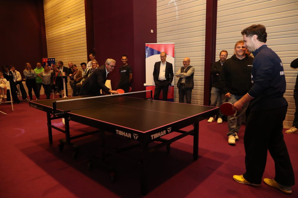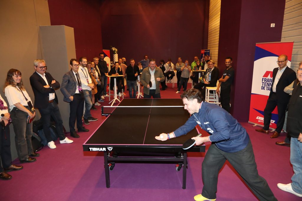 Les différents partenaires ont ensuite pu assister à une démonstration d’Esteban Dorr (médaillé de bronze en double messieurs aux Championnats du monde de tennis de table 2025 avec Florian Bourrassaud) commentée par Stéphane Lebrun, coach et père des frères Lebrun. Les invités ont ensuite eu la chance d’échanger quelques balles avec Esteban, sous les explications avisées de Stéphane.