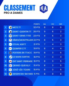 À l’issue de cette journée, Metz continue son parcours sans faute et maintient une avance confortable sur Saint-Quentin. Derrière le duo de tête, la course aux places qualificatives pour les play-offs demeure plus indécise que jamais, avec plusieurs équipes toujours au coude-à-coude. À l’opposé, la situation se complique pour les formations en difficulté, dans un championnat où chaque rencontre compte lourd dans la poursuite des objectifs.